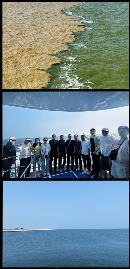 團建伊始,直奔孤東海堤。站在綿延的堤壩上,海風裹挾著大海的鹹濕撲面而來,極目遠眺,是一望無際的渤海碧波;低頭俯瞰,是堤壩靜靜守護的靜谧灘塗。待團隊集合完畢,我們登上早已等候的遊船,引擎聲輕響,遊船緩緩向海中央駛去。有人倚在甲闆欄杆上極目遠眺,有人在船艙内靜候奇觀,所有人的目光都緊緊鎖定著遠方海面。遊船駛過,成群海鷗展翅追随,蔚藍海洋、潔白鷗鳥與金色陽光相映,構成一幅靈動鮮活的畫卷。半小時之後,期待已久的景象映入眼簾——渾濁的黃河水與清澈的海水相遇,一道清晰的“黃藍交界線”在海面鋪展開來,黃色的雄渾與藍色的深邃碰撞出震撼的視覺奇觀,大家紛紛舉起手機定格此刻,歡呼聲、驚歎聲與海浪聲交織在一起,團隊的活力與熱情在這天地間被徹底點燃。